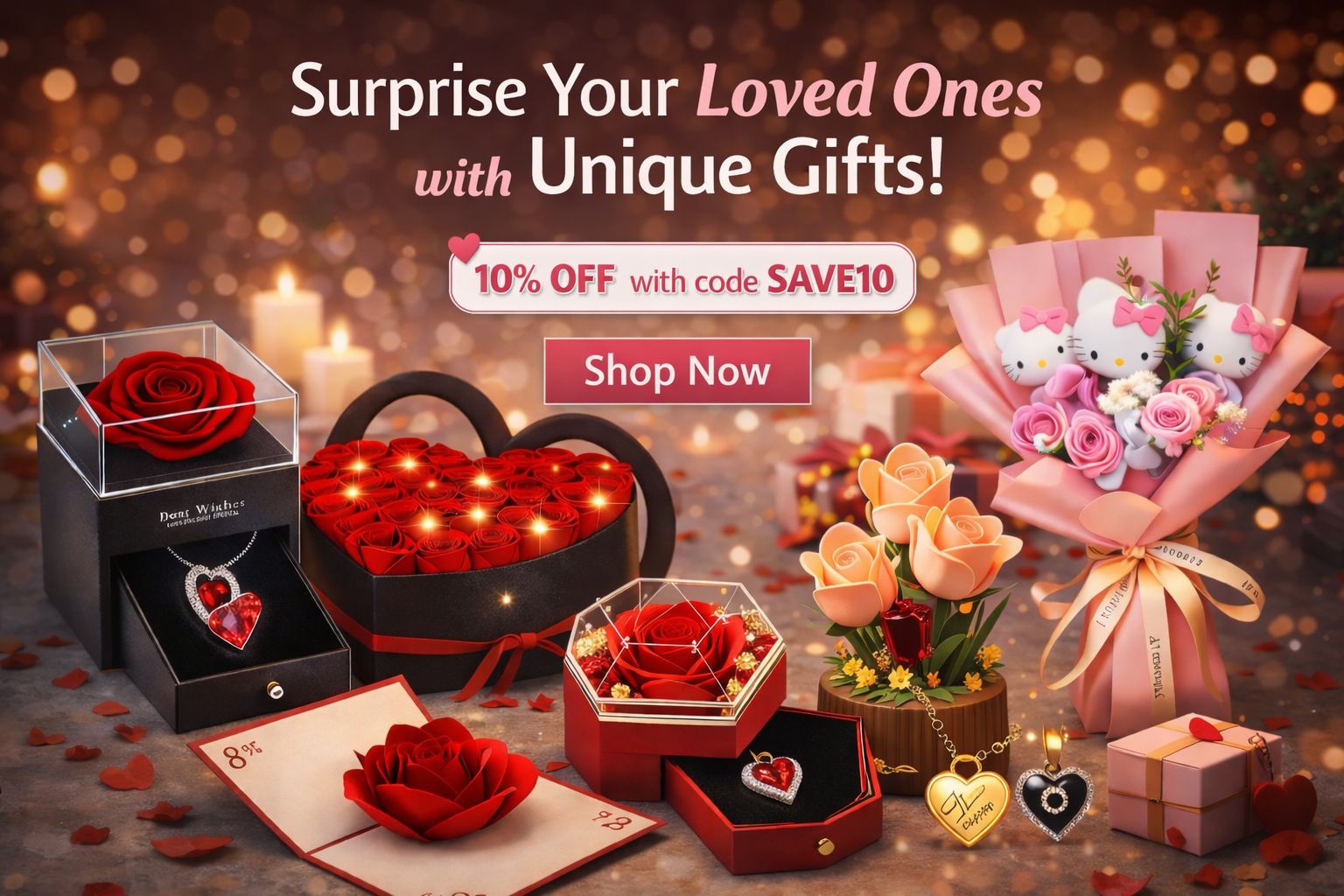Heart Rose Gift Box with LED Lights & “I Love You” Necklace